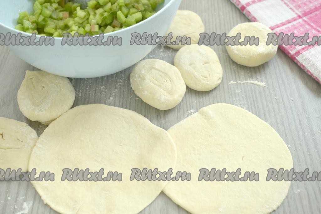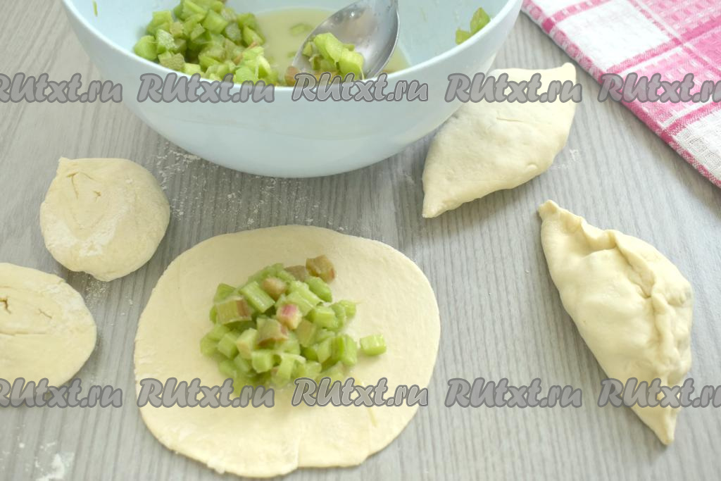 В центр лепёшки выкладываем 1 столовую ложку начинки из ревеня без выделившегося сока. Поднимаем края теста над начинкой, формируя пирожок.
