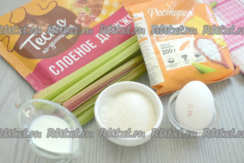 Подготовим продукты. Пирожки с ревенем можно готовить как из слоёного дрожжевого теста (его я в этот раз и купила), так и из бездрожжевого слоёного теста. Крахмал можно взять как кукурузный, так и картофельный. Прежде всего достаём тесто из морозилки и оставляем его размораживаться при комнатной температуре.