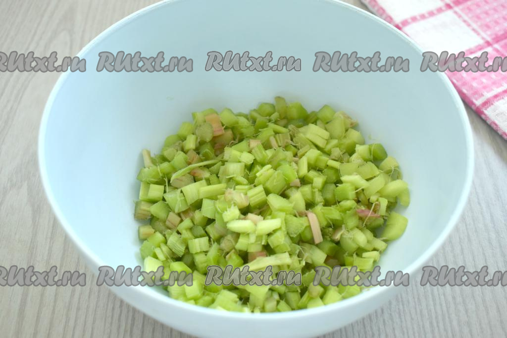 Стебли ревеня моем. Очищаем ревень, удаляя с его поверхности грубые волокна. Нарезаем ревень на маленькие кубики, складываем в миску.