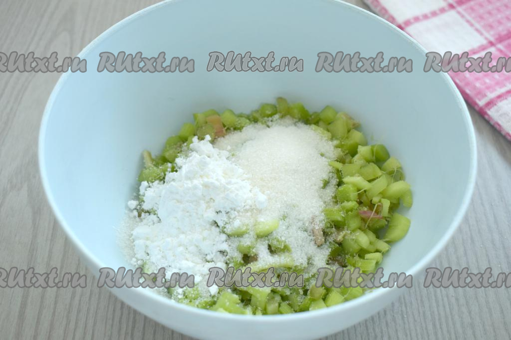 В миску с ревенем добавляем сахар и крахмал, перемешиваем и оставляем на время, пока будем заниматься тестом (ориентировочно на 10 минут).