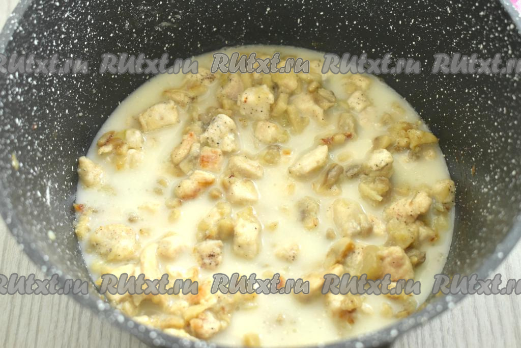 К грибам и куриному мясу, покрытым мукой, вливаем сливки (я взяла сливки жирностью 10%, но можно использовать и более жирные сливки), перемешиваем. Если нужно, подсаливаем. Даём сливкам закипеть, уменьшаем огонь и тушим минуты 2 (до загустения сливок). Снимаем с огня, даём остыть и начинка для жульена готова.
