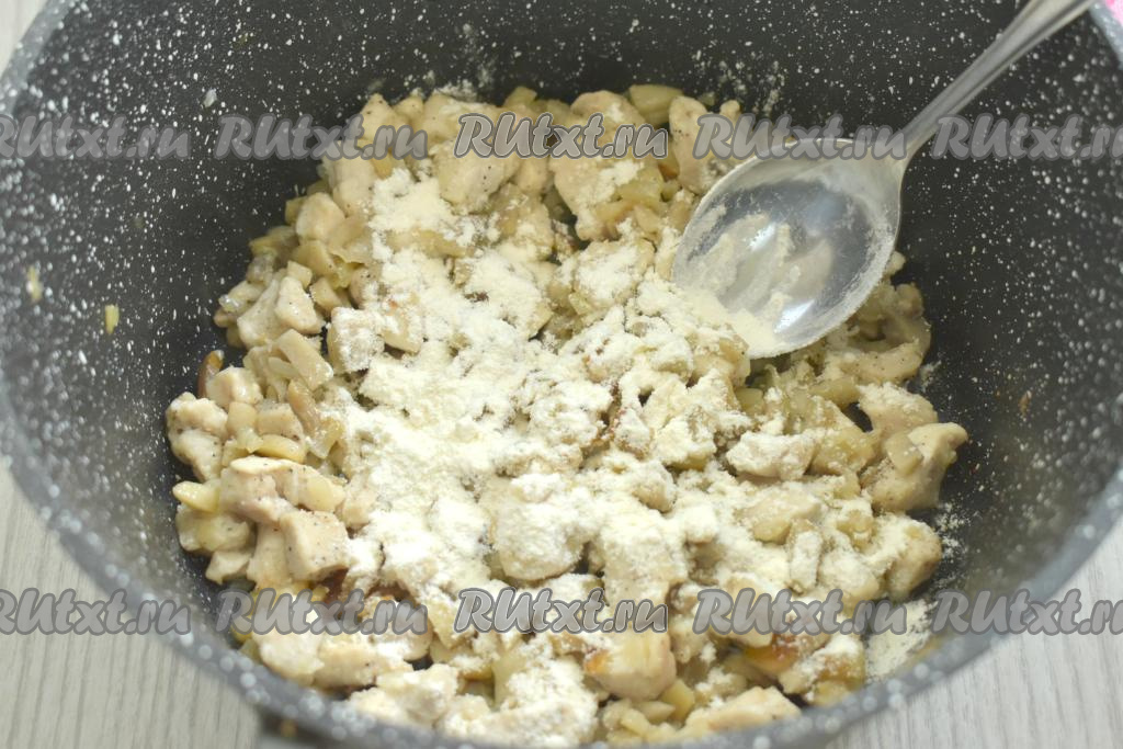 Затем добавляем 1 столовую ложку (без горки) муки, тщательно перемешиваем, покрывая равномерно мукой шампиньоны с мясом курицы (на это потребуется примерно 1 минута).