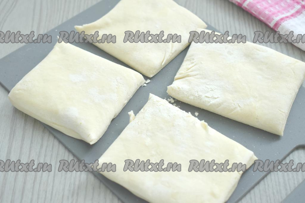 Размороженное слоёное тесто разрезаем на 4 квадрата (мы будем формировать 4 порционных жульена).
