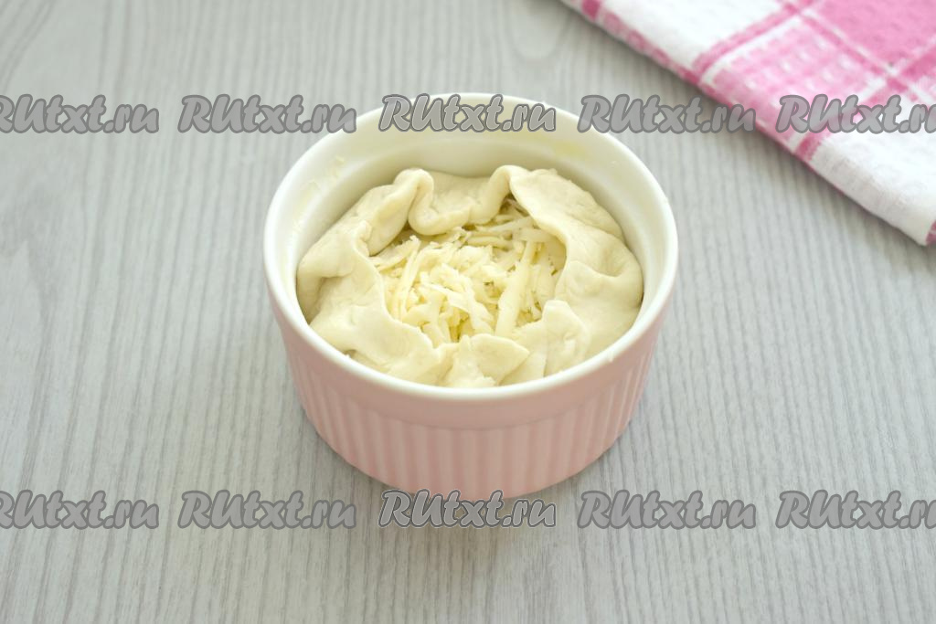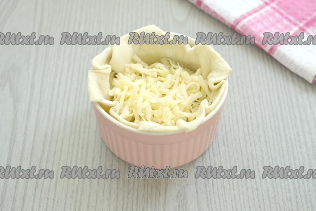 Натираем сыр на крупной тёрке. Равномерно распределяем натёртый сыр по формочкам.