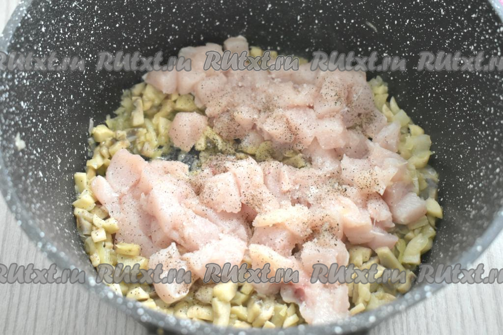 Куриное филе нарезаем на небольшие кусочки, добавляем к луку и грибам, по вкусу солим и перчим, перемешиваем, готовим 10 минут, время от времени перемешивая.
