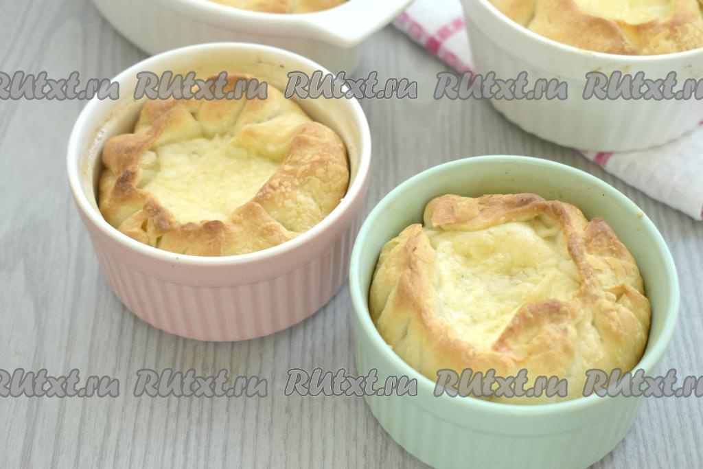 4 формочки с жульеном в слоёном тесте с курицей и грибами отправляем в духовку, разогретую до 180 градусов, запекаем 25-30 минут.