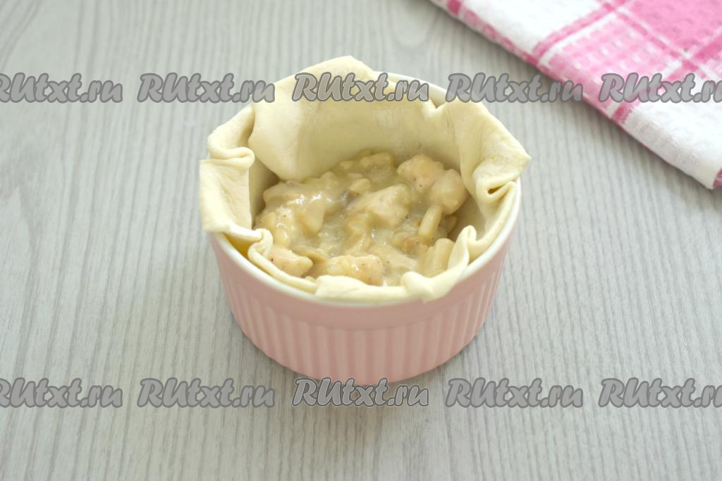 Курино-грибную начинку зрительно разделяем на 4 части, раскладываем по 4 формочкам поверх теста.