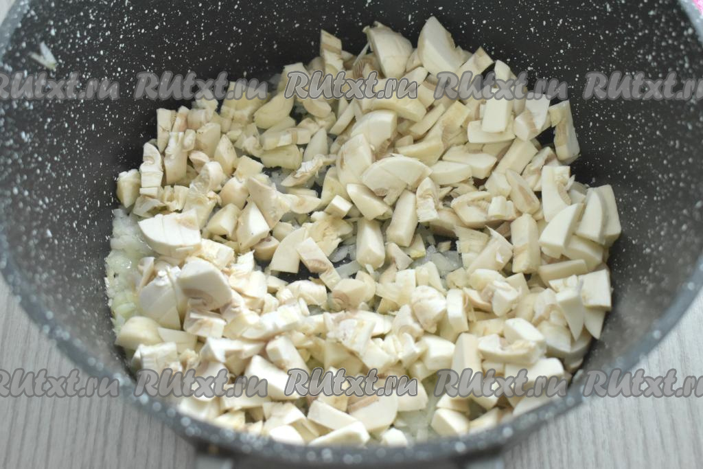 К обжаренному луку добавляем шампиньоны, нарезанные на небольшие кубики, обжариваем 5 минут, иногда помешивая.