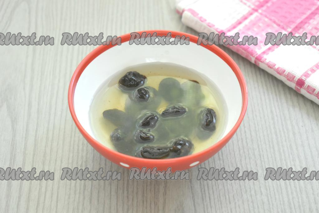 Чернослив без косточек перекладываем в небольшую миску, полностью заливаем кипятком и оставляем на 10 минут, затем воду сливаем. Чернослив выкладываем на бумажное полотенце и даём обсохнуть.