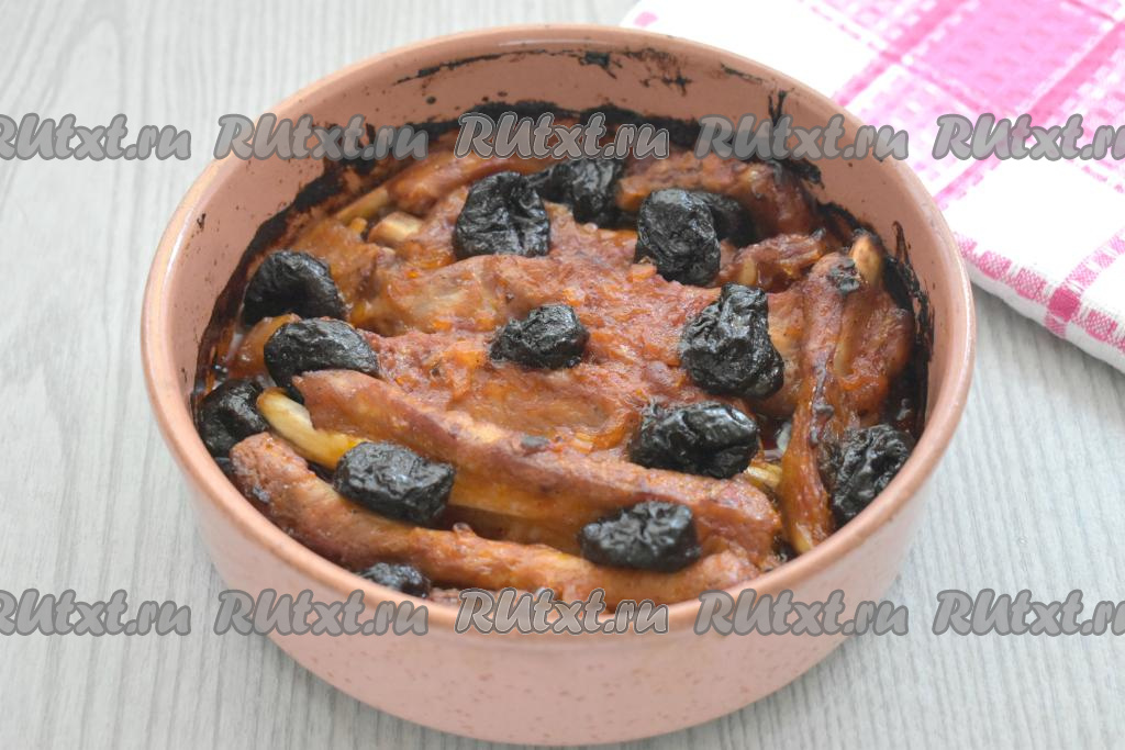 Готовое блюдо достаём из духовки. Нежные, мягкие, аппетитные свиные рёбрышки вместе со сладким черносливом раскладываем по тарелкам и в горячем виде, дополнив гарниром, подаём к столу.