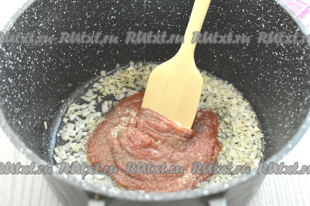 К луку, обжаренному до мягкости, добавляем томатный соус, по вкусу солим и перчим. Перемешиваем получившийся томатно-луковый соус, убираем с огня, даём немного остыть.