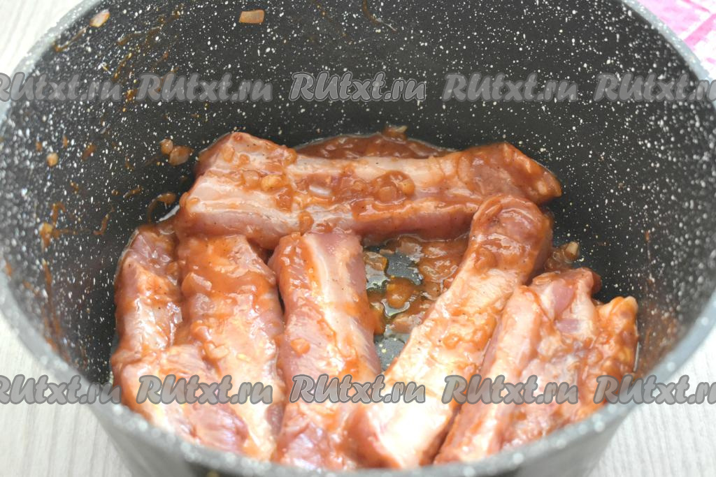 В получившийся томатный соус с луком выкладываем свиные рёбрышки, перемешиваем, чтобы каждая часть ребра была покрыта соусом.