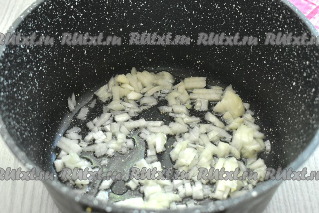 Лук очищаем. В сковороде (или в сотейнике с толстым дном) разогреваем растительное масло, выкладываем мелко нарезанный лук, обжариваем его на среднем огне до мягкости (в течение 3-4 минуты), периодически перемешивая.