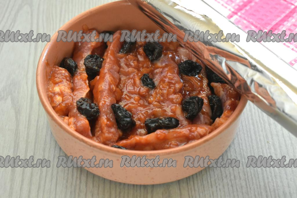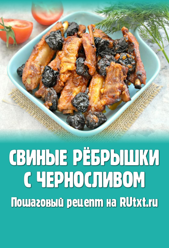 Свиные рёбра, покрытые томатным соусом, выкладываем в форму для запекания. Поверх рёбер раскладываем подготовленный чернослив. Форму накрываем фольгой, сложенной в два слоя, и отправляем в духовку, разогретую до 180 градусов.