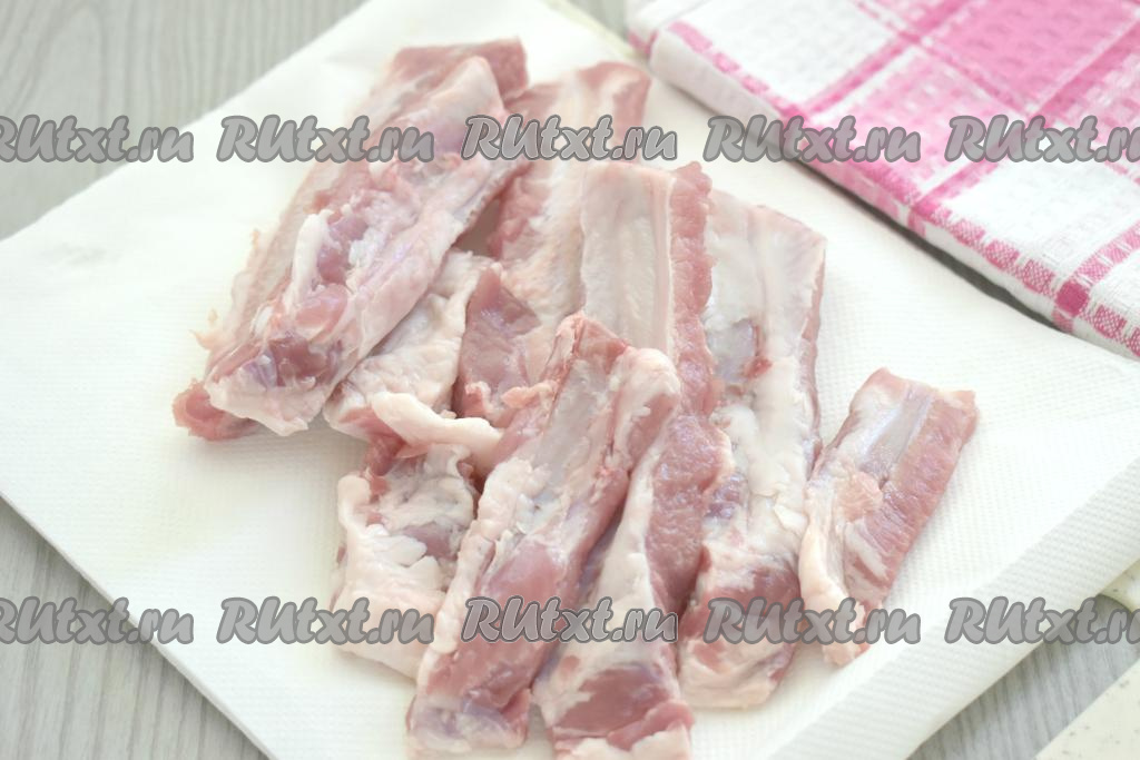 Свиные рёбра ополаскиваем проточной водой, разрезаем на небольшие части.