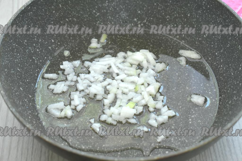 Пока варится картошка, обжарим овощи с грибами. Для этого шампиньоны нужно промыть водой, удаляя с грибов загрязнения. В сковороде разогреть растительное масло, выложить очищенный и мелко нарезанный лук, обжарить минуты 3 на среднем огне, не забывая иногда помешивать.
