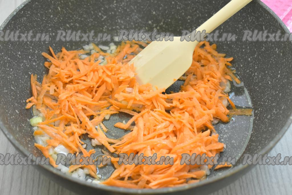К обжаренному луку выложить очищенную морковку, натёртую на крупной тёрке, перемешать овощи и обжаривать их минут 5-6 (до мягкости моркови), периодически перемешивая.