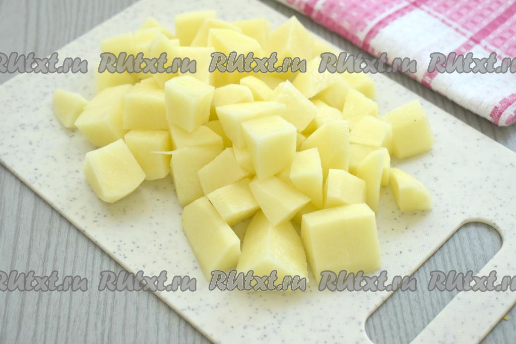 Пока бульон закипает, нужно очистить картошку, нарезать на средние кубики. В закипевший бульон выложить картошку, дать закипеть, уменьшить огонь и варить 15 минут (до мягкости картофеля).