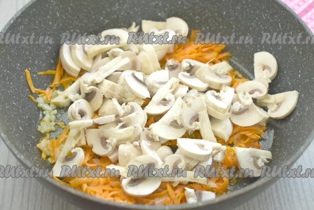 Шампиньоны нарезать на тонкие ломтики, выложить к обжаренным овощам, перемешать и готовить в течение 6-7 минут, иногда помешивая, а затем убрать с огня.