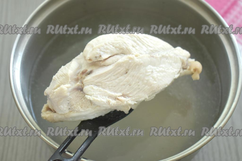 После того как мясо сварится, достать его из бульона, дать немного остыть. Бульон, если нужно, процедить, вернуть его в кастрюлю, поставить на огонь. Посолить куриный бульон, довести до кипения.