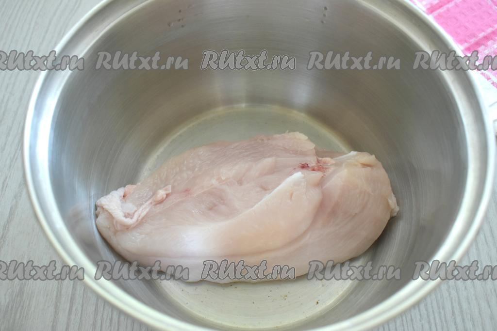Части курицы (у меня - часть куриной грудки на кости) промыть водой, выложить в кастрюлю, залить 1,5 литрами воды, поставить на достаточно сильный огонь. После закипания воды, убрав с поверхности бульона пену, варить минут 25-30 (до готовности куриного мяса) на небольшом огне.