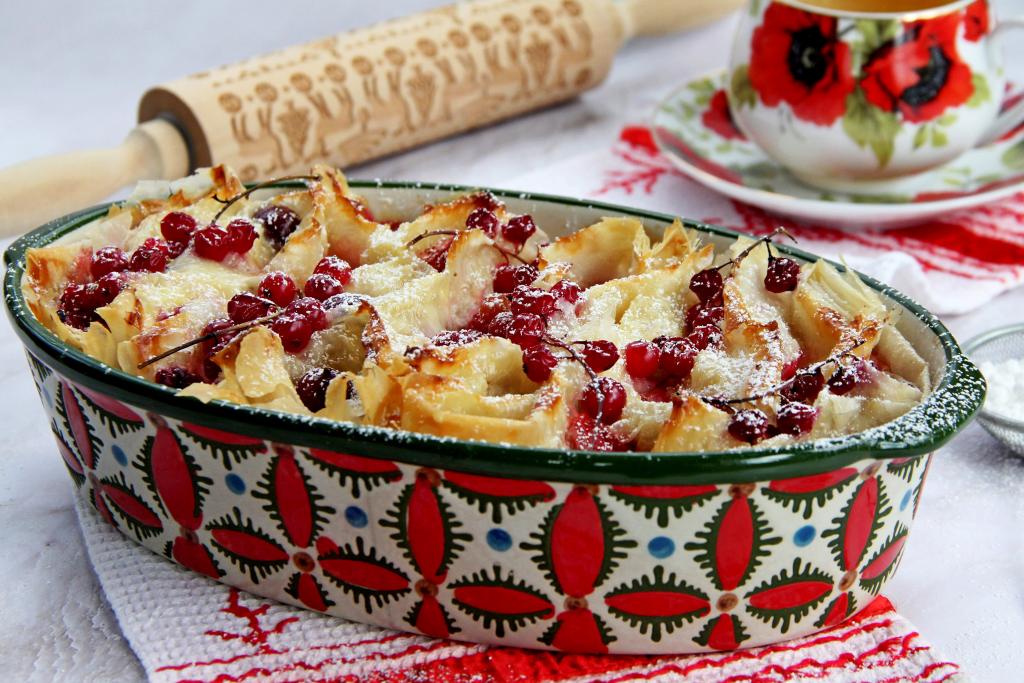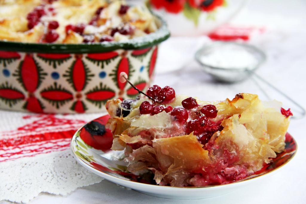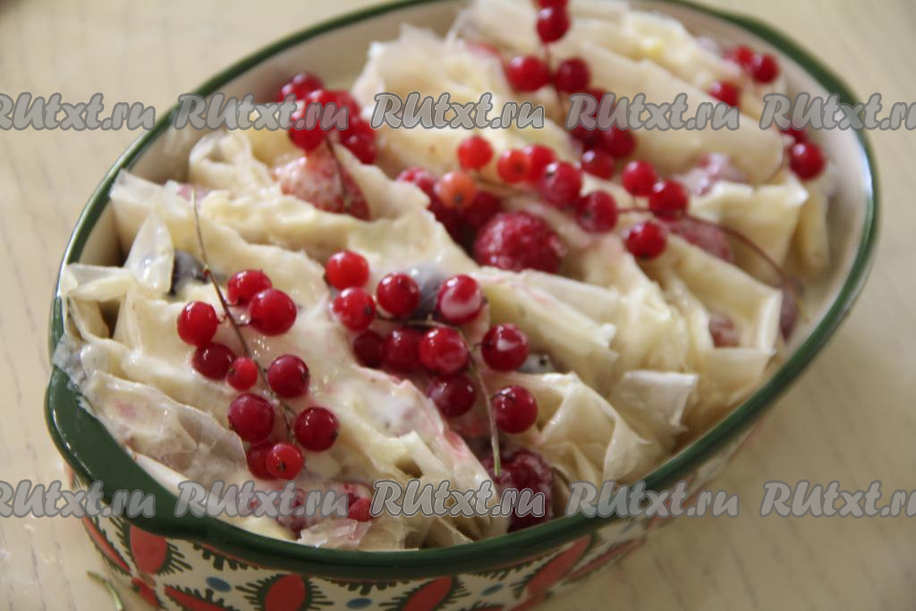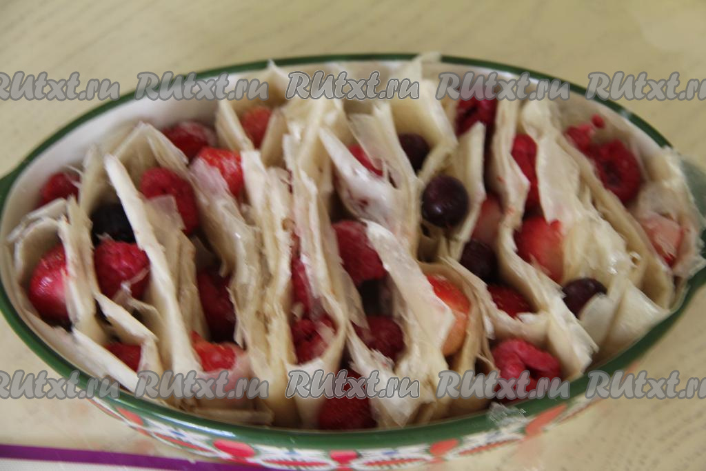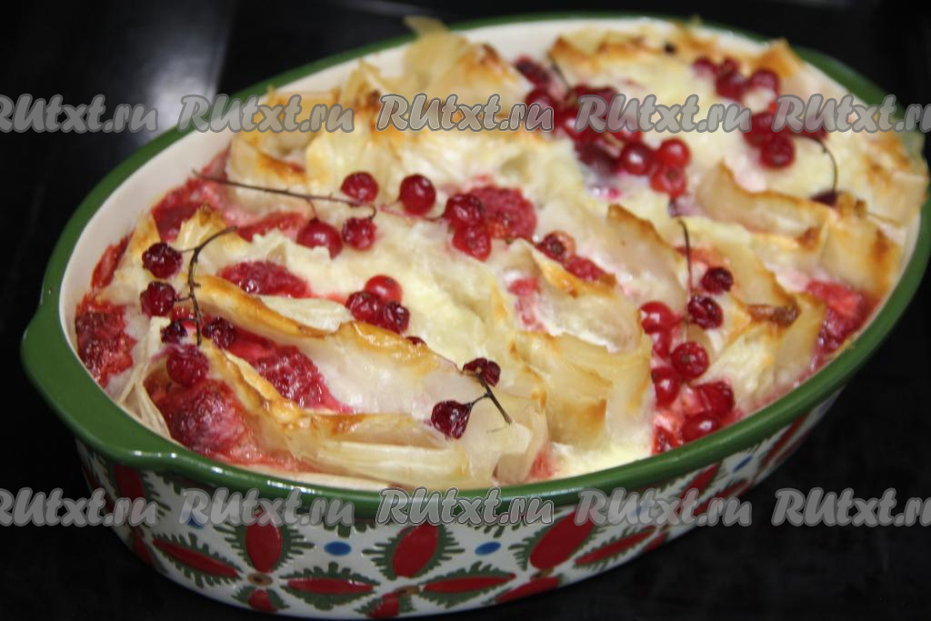 Готовую выпечку достать из духовки, дать остыть, а затем нежный, вкусный, воздушный пирог из теста фило с ягодами подать к столу.