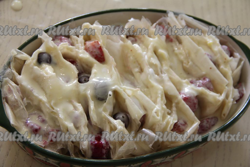 Сметанной заливкой равномерно покрыть сверху пирог из теста с фило с ягодами.