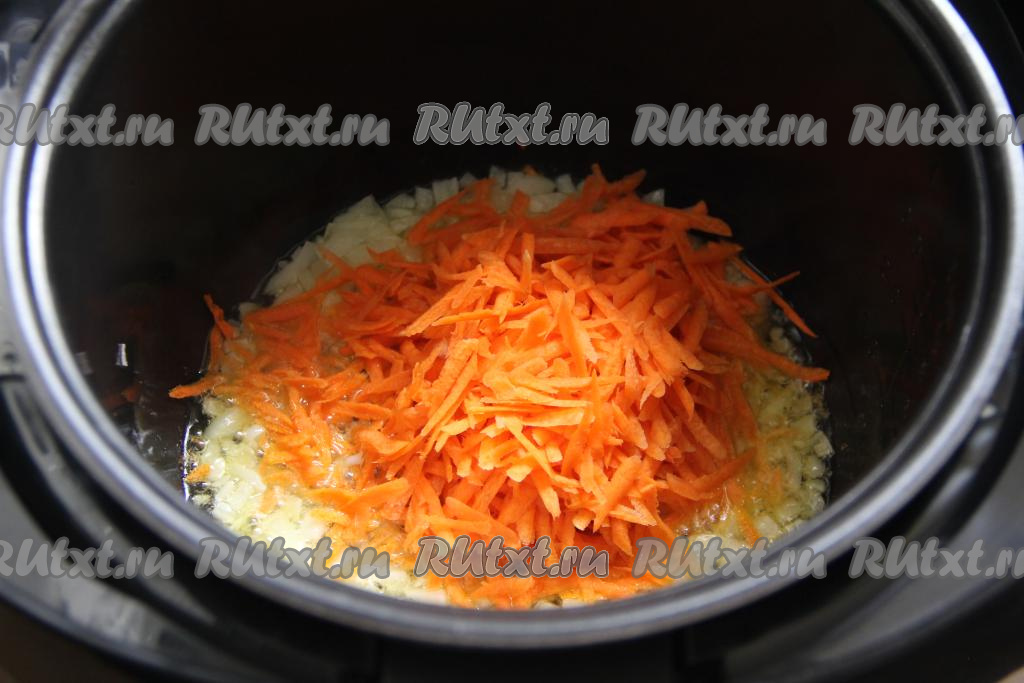 К обжаренному луку выложить натёртую на крупной тёрке морковку, перемешать, обжаривать овощи 6-7 минут (до мягкости моркови), иногда помешивая.