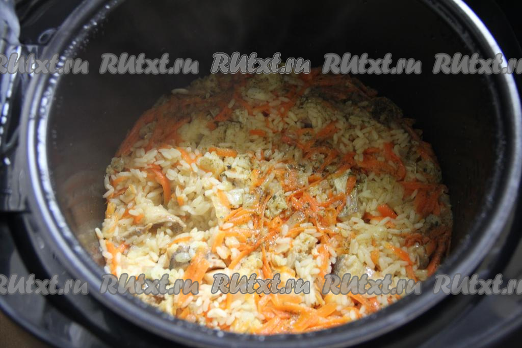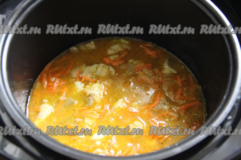 Влить 400 миллилитров воды комнатной температуры, перемешать, выставить режим "Плов" на 35 минут, крышку мультиварки закрыть. Оставить блюдо готовиться до звукового сигнала.