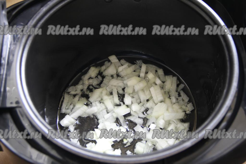 Растительное масло влить в чашу мультиварки, выставить на 15 минут режим "Жарка". Луковицу мелко нарезать, выложить в чашу мультиварки и обжарить в течение 5-6 минут (до прозрачности лука), не забывая периодически перемешивать.