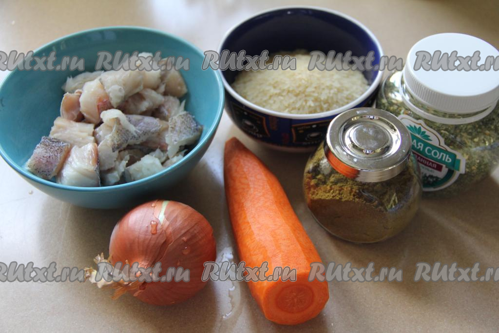 Подготовить продукты. Для этого блюда можно купить филе минтая, разморозить, нарезать на небольшие кусочки. А можно купить тушки минтая, разморозить рыбу, очистить от внутренностей и плавников, снять кожу, отделить филе от хребта и костей, после этого нарезать филе на небольшие кусочки. Всего нам потребуется 400 грамм филе минтая. Лук и морковь почистить. Рис хорошо промыть водой, а затем лишнюю воду слить.