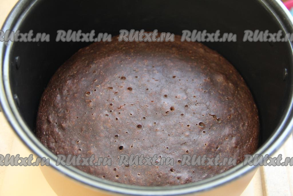 Установить чашу в мультиварку, закрыть крышку и выставить режим "Выпечка" на 1 час. После звукового сигнала мультиварки, сообщающего от окончании режима, нужно проверить готовность бисквита.