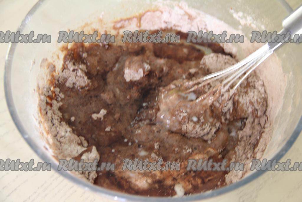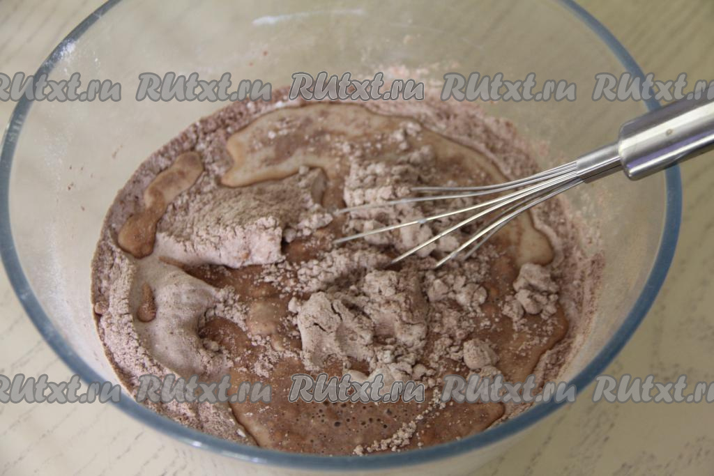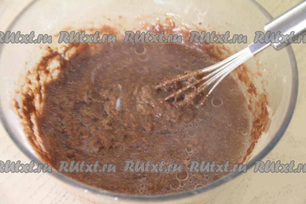 Аккуратно, чтобы не обжечься, тонкой струйкой, непрерывно перемешивая венчиком, влить в тесто частями крутой кипяток. Очень важно, вливая тонкой струйкой кипяток и тщательно перемешивая венчиком, контролировать густоту замешиваемого бисквитного шоколадного теста.