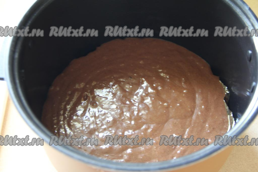 Из бумаги для выпечки вырезать круг, равный диаметру дна чаши мультиварки. Выложить этот круг на дно чаши мультиварки. Бумага нужна для того, чтобы бисквит не пристал ко дну в процессе выпечки. Смазать бока чаши и бумагу растительным маслом. Выложить шоколадно-бисквитное тесто в чашу мультиварки.