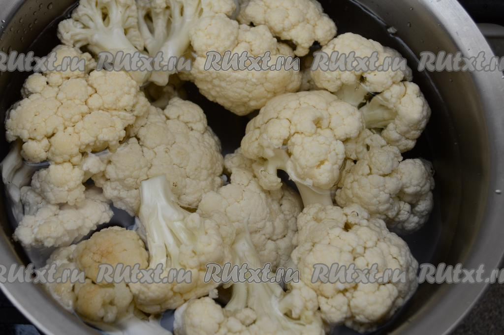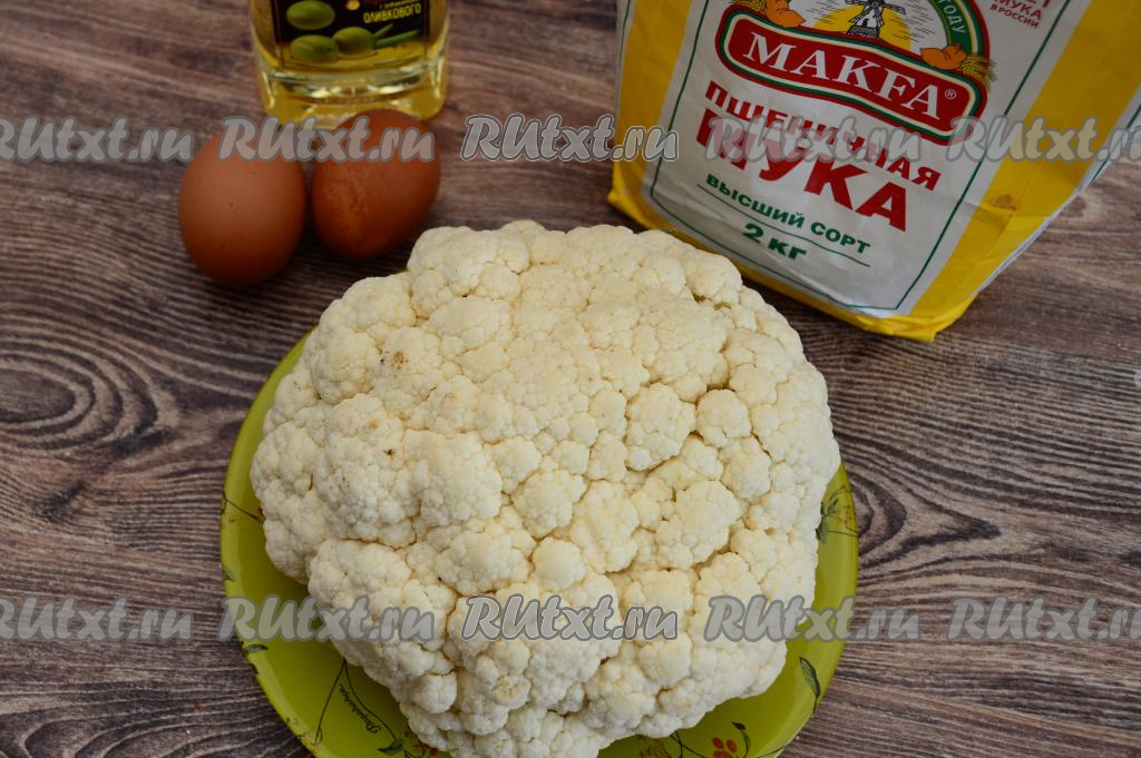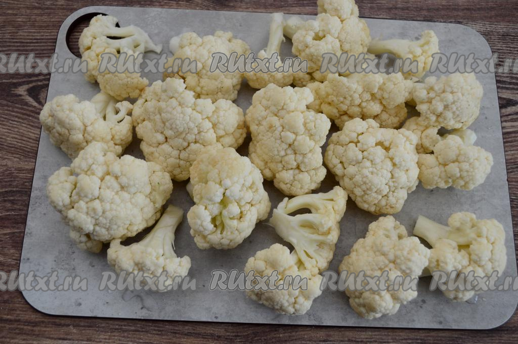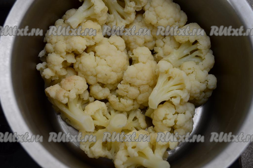 Подготовить продукты. Цветную капусту промыть водой, срезать, если есть, с поверхности кочана тёмные точки.