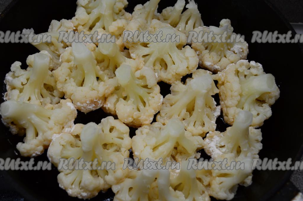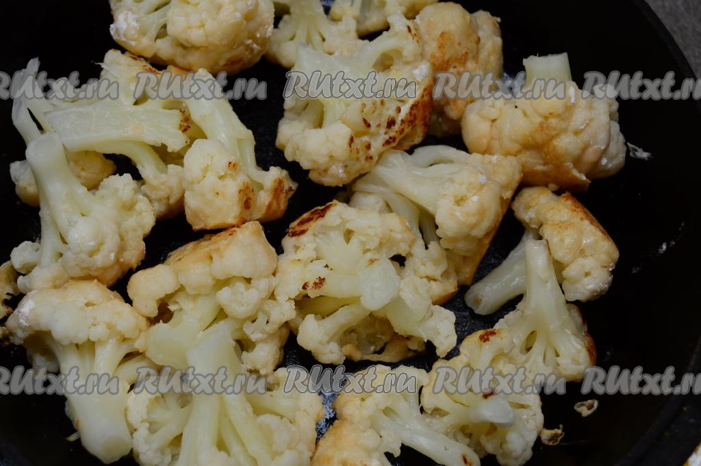 Сковороду хорошо разогреть с добавление растительного масла. Выложить соцветия цветной капусты в один слой в разогретую сковороду "пушистой" частью вниз, как на фото.