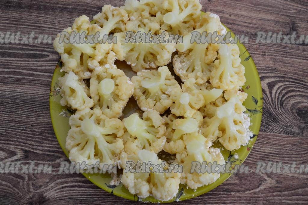 Соцветие цветной капусты, покрытое яйцом и мукой, выложить на плоскую тарелку. Постепенно таким образом подготовить все соцветия капусты, выкладывая их рядом на тарелку.