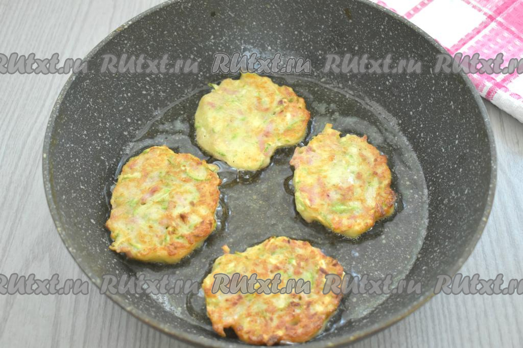 Тесто для кабачковых оладий с ветчиной и сыром должно получиться вязким, в меру густым, как на фото. Если тесто получилось жидковатым (многое зависит от того, насколько хорошо вы отжали кабачок от жидкости), тогда добавьте ещё немного муки, доводя тесто до нужной густоты.