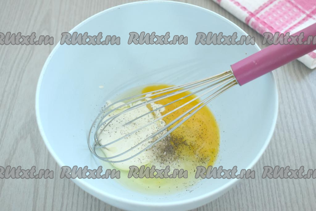 Сметану можно взять любой жирности (я купила жирностью 20%). Разбиваем в миску яйцо, добавляем сметану и чёрный молотый перец, можно немного подсолить, перемешиваем венчиком до однородности.