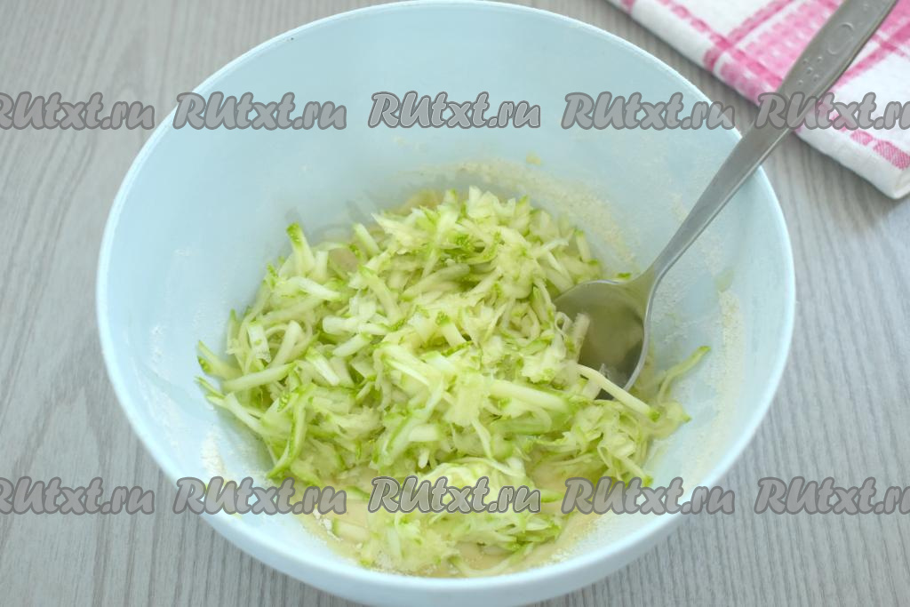 Кабачок моем, кожуру, по желанию, срезаем (я использовала молодой кабачок с тонкой кожицей, поэтому очищать его от кожуры не стала). Если у кабачка крупные семечки, их нужно будет удалить. 200 грамм подготовленного кабачка натираем на крупной тёрке в отдельную миску, солим и оставляем на 5-10 минут. Кабачок за это время выделит сок. Тщательно отжимаем выделившийся сок (выделившийся сок нам не понадобится). В миску с тестом выкладываем отжатую кабачковую массу.