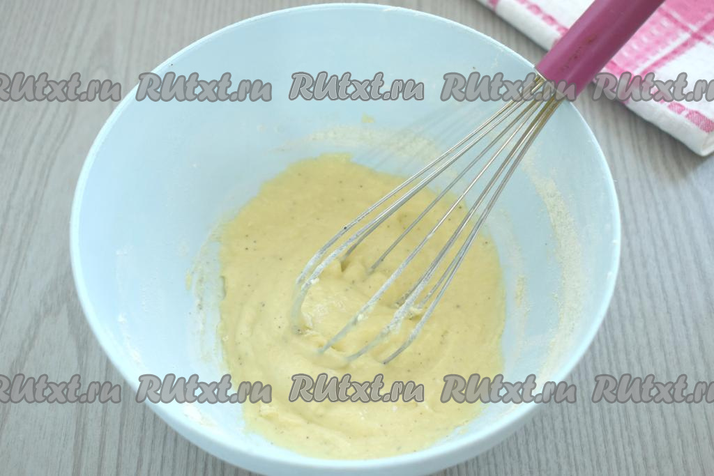 В получившуюся массу просеиваем 2 столовых ложки муки, перемешиваем венчиком.