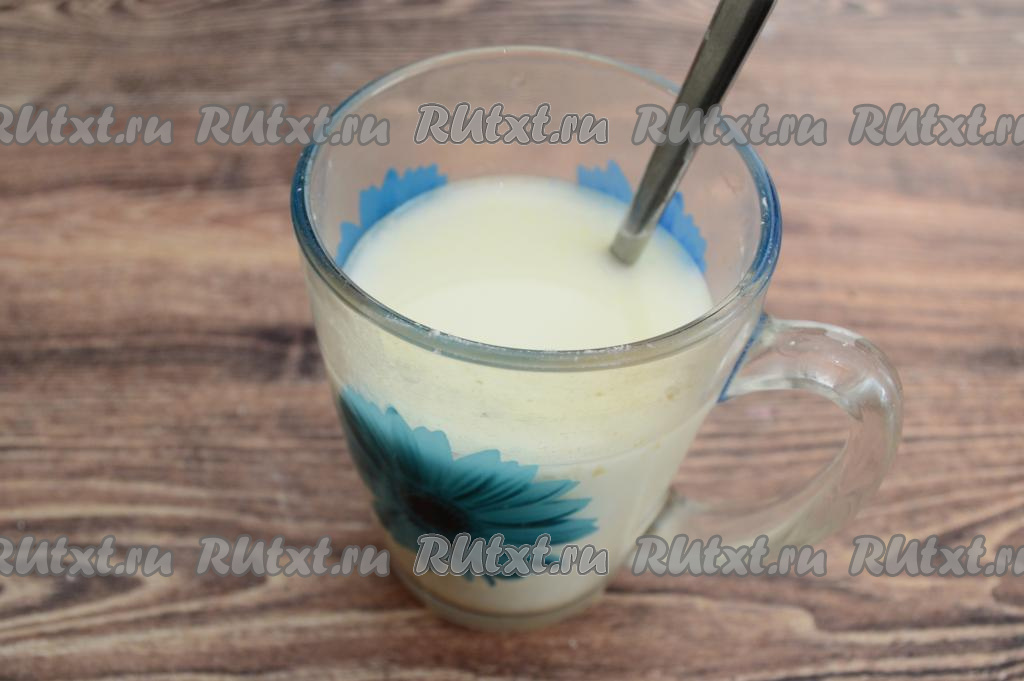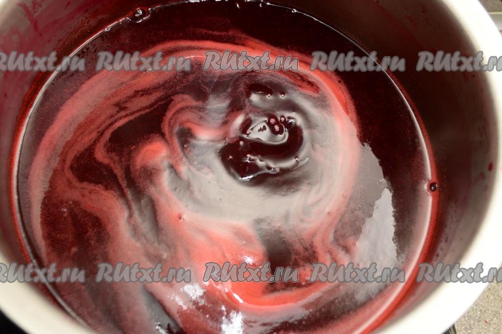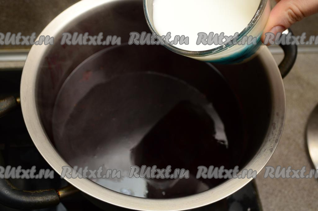 Вернуть процеженный напиток с мякотью в кастрюлю, поставить на достаточно сильный огонь, довести до кипения. В это время в чашку влить 200 миллилитров холодной воды, всыпать крахмал, перемешать до однородности крахмальную смесь.
