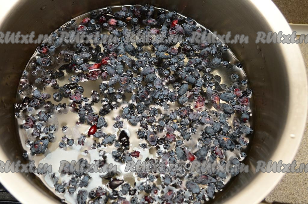 Жимолость, если нужно, перебрать. Затем выложить в сито, хорошо промыть проточной водой, лишней воде дать стечь. В кастрюлю, в которой будете варить кисель, выложить подготовленную свежую (или замороженную) жимолость, влить 1 литр воды, всыпать сахар, перемешать и поставить на достаточно сильный огонь.