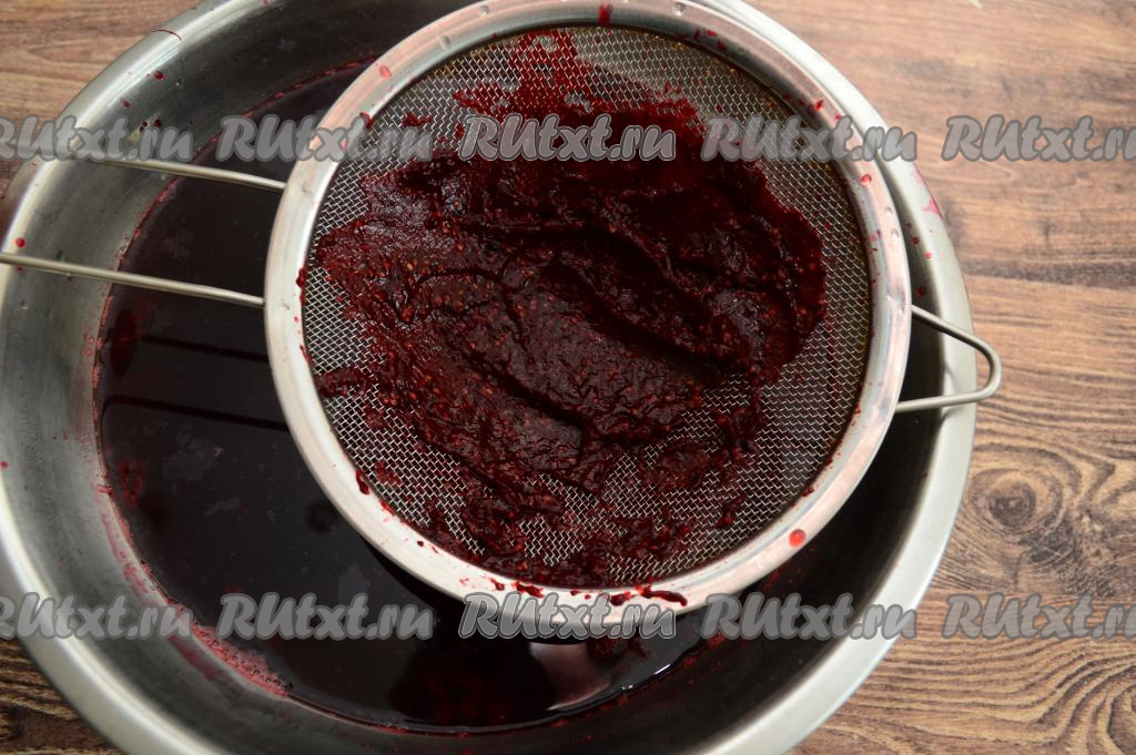 Готовый напиток снять с огня, дать ему остыть в течение нескольких минут, после этого процедить через сито в глубокую миску (или другую удобную посуду). В сите останутся ягоды. В миску с процеженным напитком протереть через сито варёную жимолость. В результате в миске будет напиток с мякотью, а в сите останется практически сухой жмых (жмых можно выбросить).