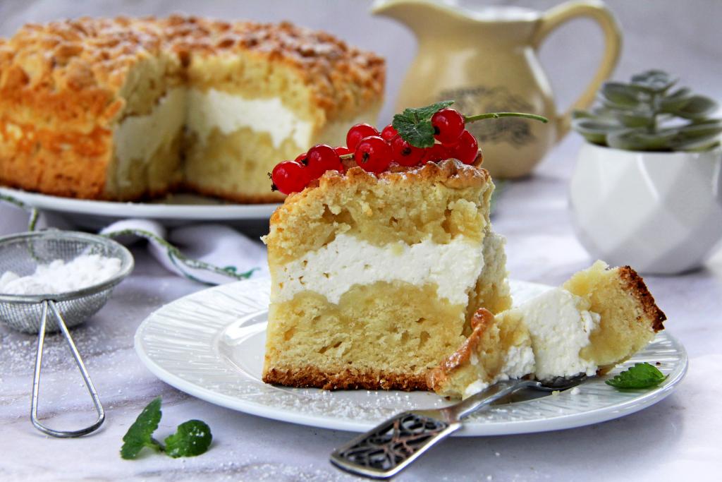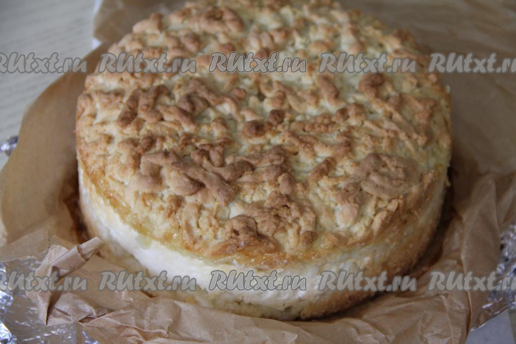 В меру сладкий, вкусный, аппетитный тёртый пирог с нежной начинкой из творога нарезать на кусочки и подать к столу.