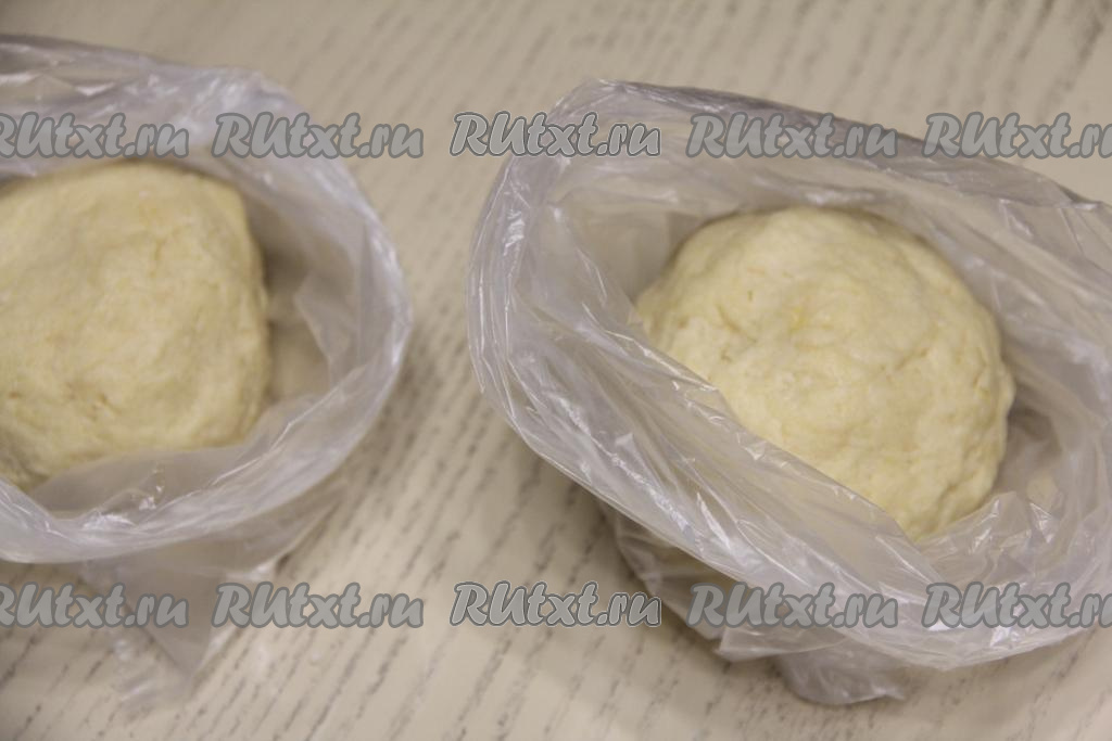 Разделить тесто на две равные части. Каждую часть теста поместить в целлофановый пакет и убрать в морозилку на 1-2 часа.