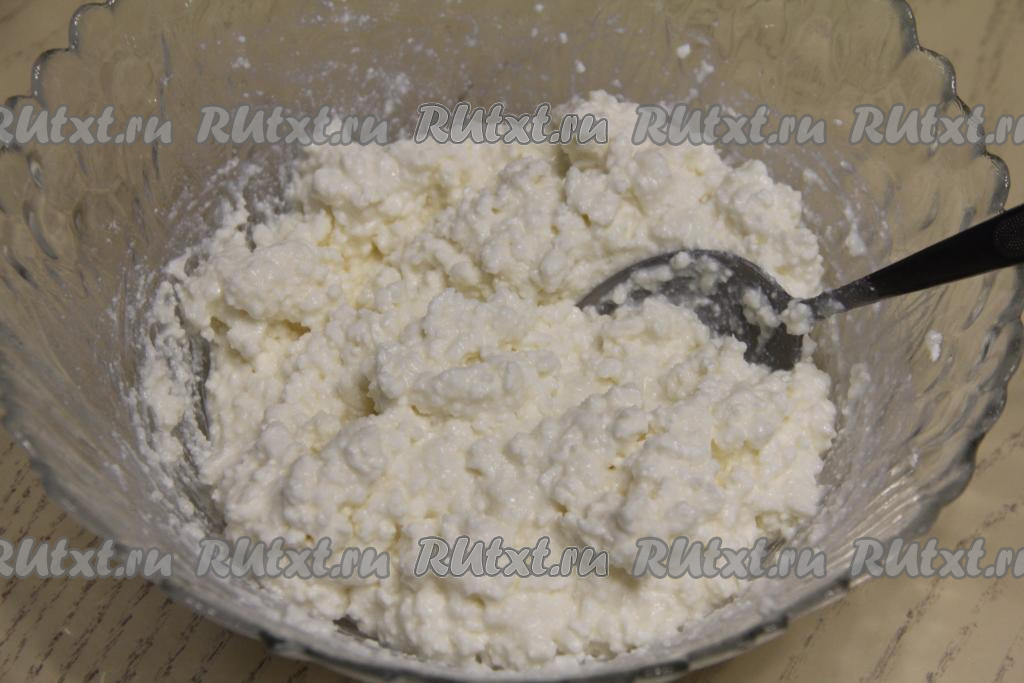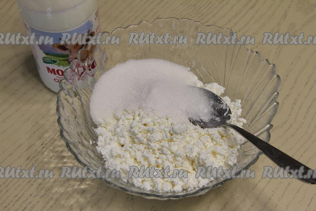 После того как тесто охладится в морозилке, приготовим начинку. Для этого в миске нужно соединить творог, сахар и ванильный сахар.