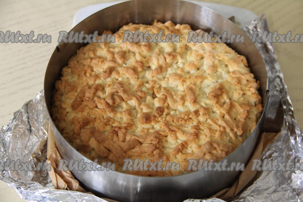 Поставить форму в духовку, разогретую до 200 градусов, выпекать тёртый пирог с творогом минут 45 (до лёгкого подрумянивания теста).
