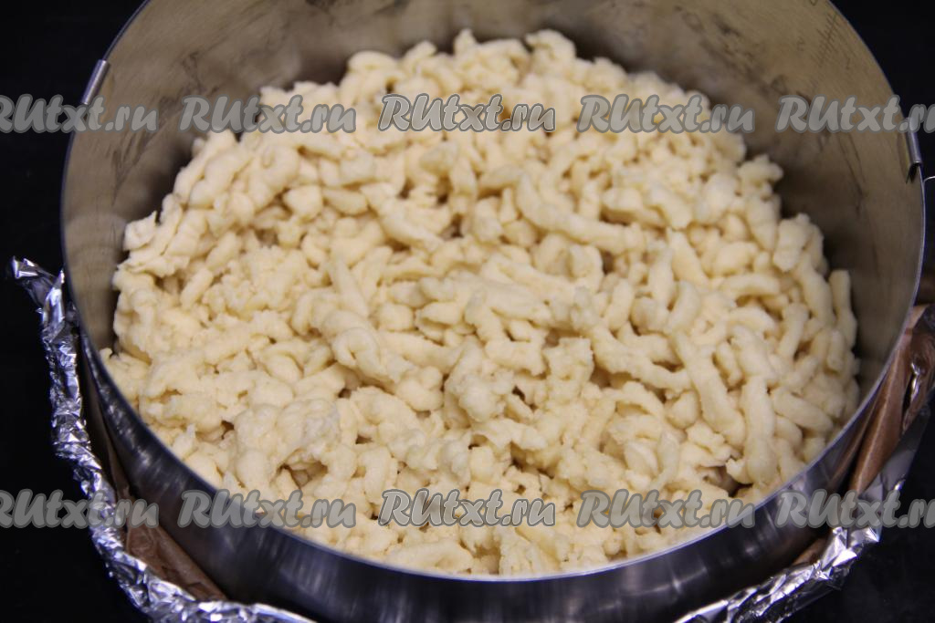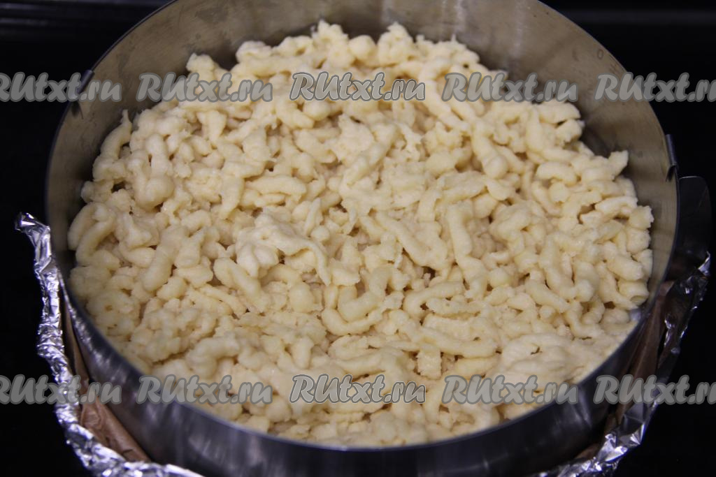 Достать одну часть теста из морозилки, натереть на крупной тёрке. Равномерно выложить натёртое тесто на дно разъёмной формы для выпечки диаметром 20 сантиметров.