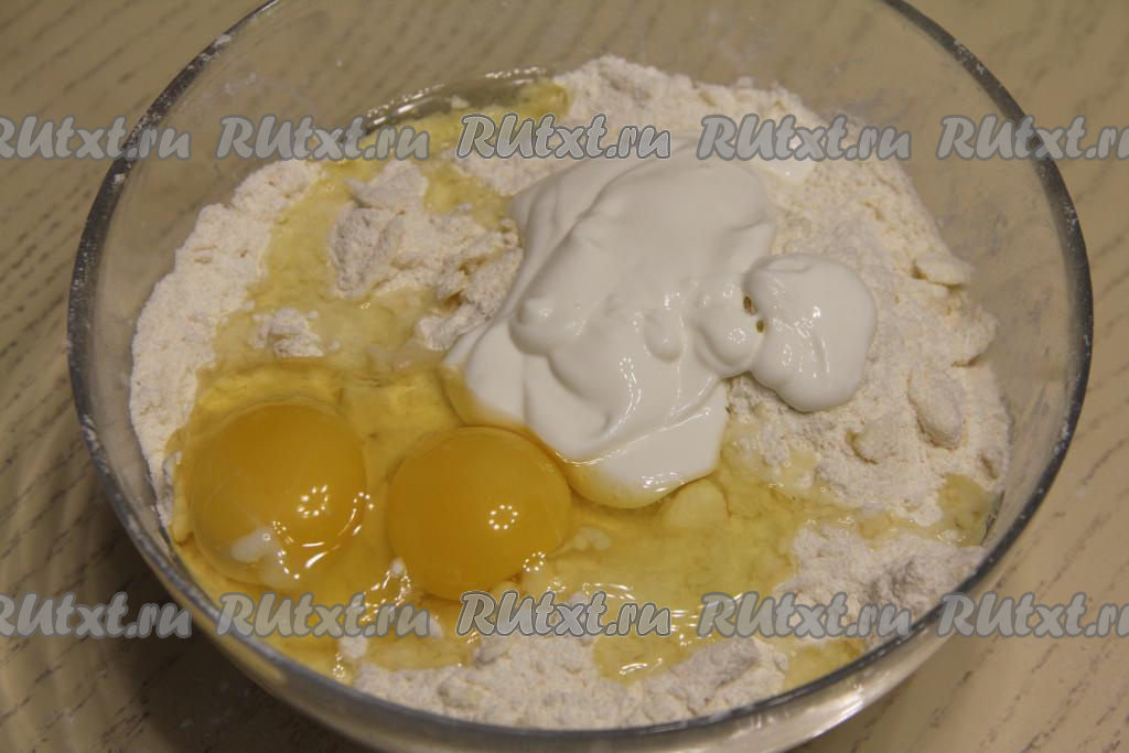 В миску с получившейся крошкой добавить яйца и сметану, перемешать. Влить 1 столовую ложку холодной воды, собирая песочное тесто в шар. Если тесто не будет собираться в шар, тогда добавьте ещё 1 столовую ложку холодной воды и хорошо вмешайте её, собирая тесто в шар.